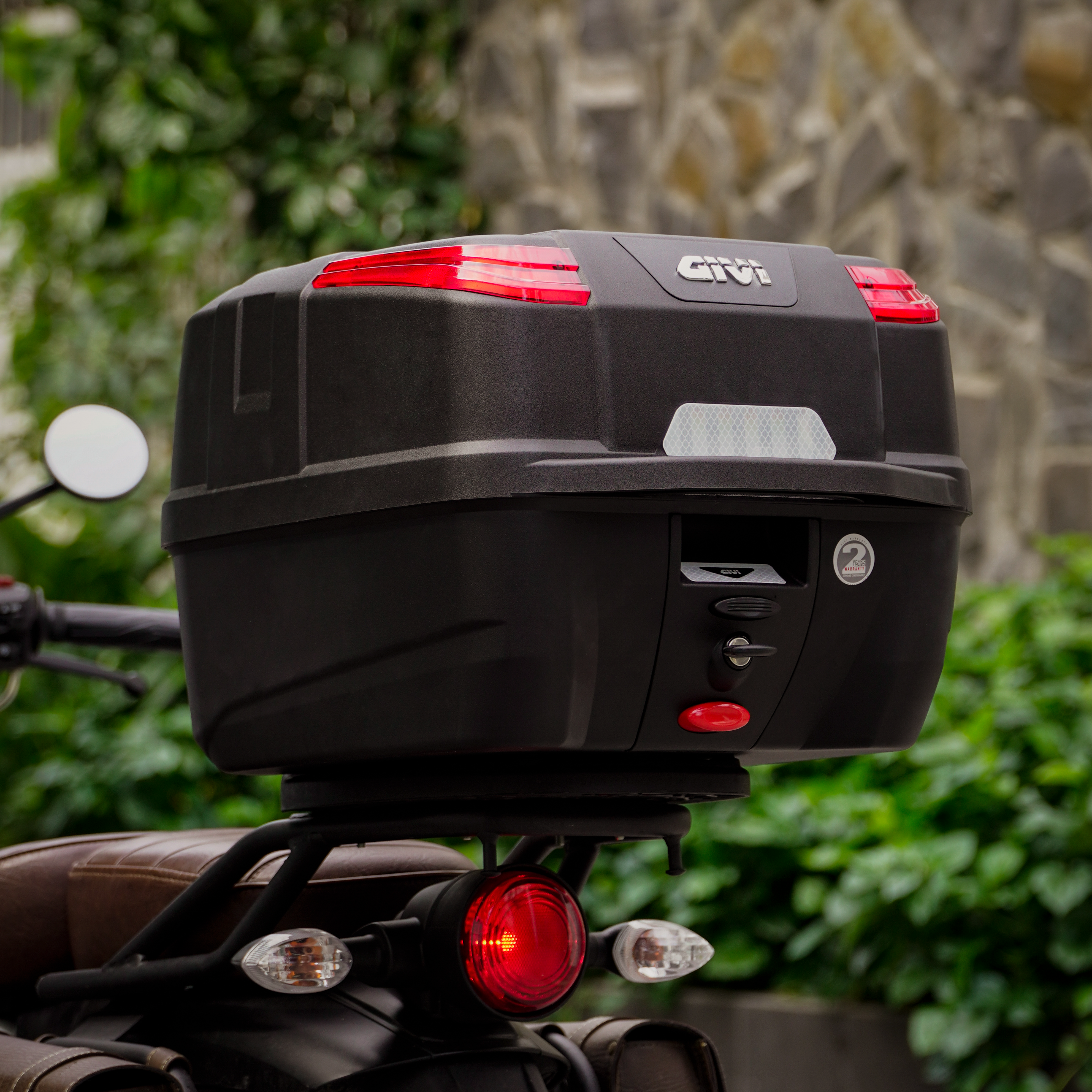The GIVI B33NM ATLAS is a mid-sized top case featuring a modern and robust design, making it an excellent choice for daily commuters and urban riders. Part of the Monolock® series, it is engineered for scooters and smaller displacement motorcycles. The case is constructed from a strong and durable proprietary Technopolymer®, ensuring longevity and resistance to fading from UV exposure. Its design allows it to comfortably store a full-face helmet with room to spare for other small items. The B33NM is equipped with the proven GIVI Micro 3 locking system, providing security and ease of use for the rider. The case comes standard with a universal plate and kit for straightforward installation on most flat luggage racks.
