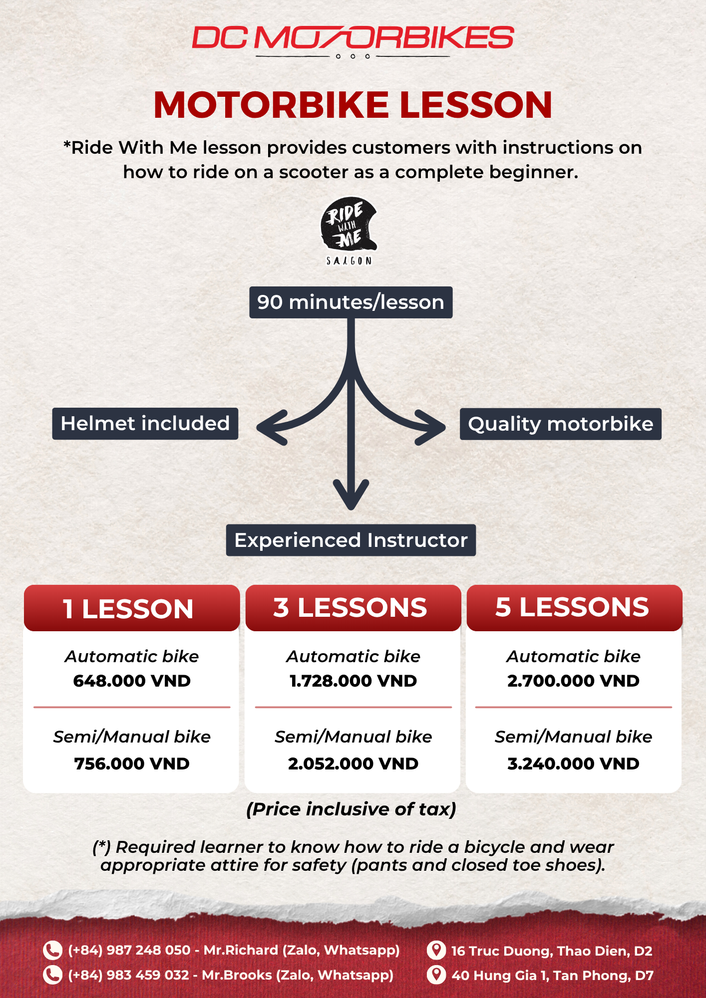 Our beginner’s lessons teach you how to drive from scratch. From learning bike functions, turn left/right, do a U-turn properly & safely, then hit the big road once you are confident. Our lessons are 90 minutes taught on open roads in less crowded areas, with experienced instructors, quality helmets, and 50cc bikes that require no license. If you already have experience with motorbikes and want to learn bikes that require advanced techniques, we offer lessons for those as well.